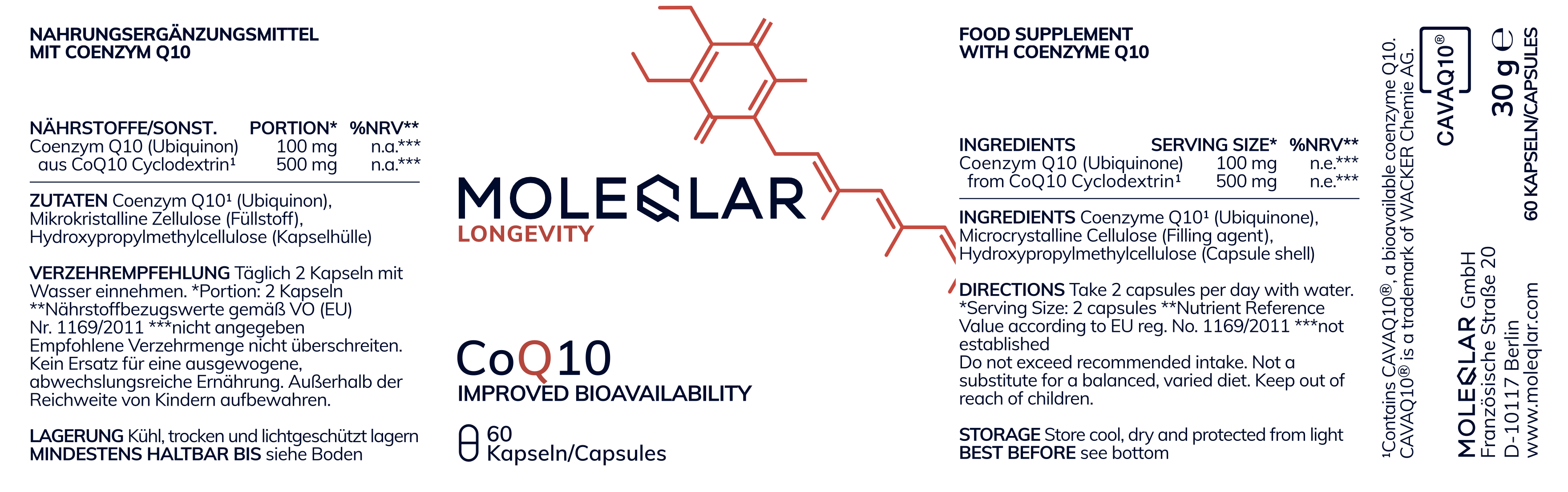 TheCoQ10 capsulescontained by MOLEQLARCoenzyme Q10 (ubiquinone)in an optimized formulation to increase bioavailability. The CoQ10 is incorporated into a complex withCyclodextrinembedded (CAVAQ10®), which significantly improves the solubility and absorption of the fat-soluble molecule. Coenzyme Q10 is a vitamin-like substance found in all human cells and is essential for theEnergy productionin the mitochondria (the "powerhouses" of the cell). It plays a critical role in theRespiratory chainand is therefore central to ATP production. Additionally, CoQ10 is apowerful antioxidant, which leads toNeutralization of free radicalscontributes to and protects cell membranes