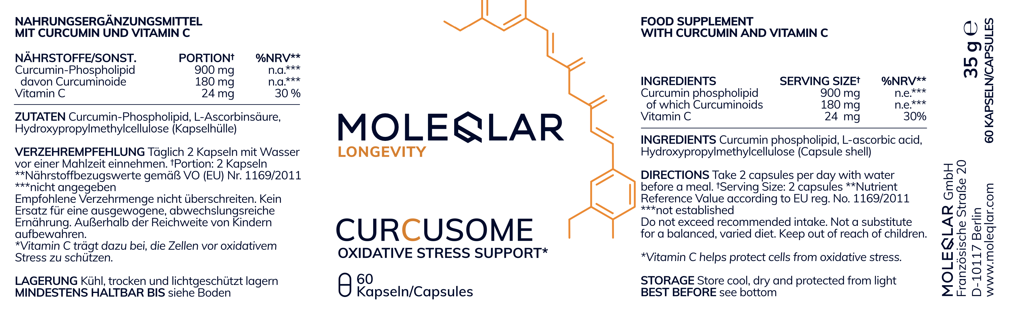 Curcusome kombiniert Curcumin mit Vitamin C in einer hochmodernen Formulierung. Das Curcumin liegt in einem Curcumin-Phospholipid-Komplex, was die Bioverfügbarkeit des Curcumins gegenüber herkömmlichem Kurkuma-Pulver deutlich erhöhen soll. Curcumin, der bioaktive Hauptbestandteil der Kurkuma-Wurzel, ist in der Forschung für seine potenziellen antioxidativen und entzündungsregulierenden Eigenschaften bekannt. Es unterstützt zelluläre Schutzmechanismen. Das enthaltene Vitamin C ergänzt dies ideal, indem es dazu beiträgt, die Zellen vor oxidativem Stress zu schützen.