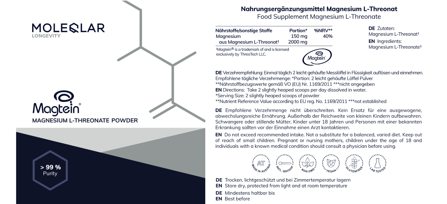 - Reines Magtein® Magnesium L-Threonat in Pulverform