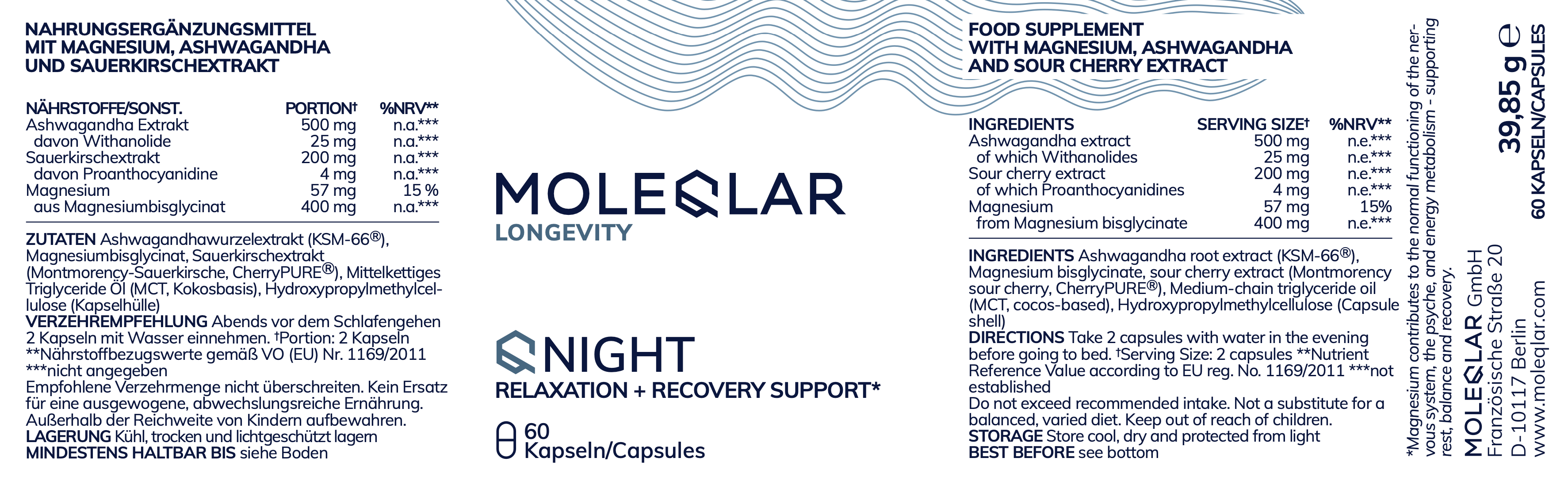 Die QNIGHT Kapseln sind ein komplexes Supplement zur Unterstützung von Entspannung und Erholung in der Nacht. Die Formel kombiniert den adaptogenen Pflanzenextrakt Ashwagandha (speziell die patentierte Sorte KSM-66®), Sauerkirschextrakt (Montmorency-Sauerkirsche, CherryPURE®), und Magnesium in der bioverfügbaren Form Bisglycinat. Ashwagandha wird als Adaptogen zur Modulation der Stressreaktion eingesetzt und kann zur mentalen Balance beitragen. Sauerkirschextrakt enthält natürliche Proanthocyanidine und wird traditionell zur Förderung eines normalen Schlafs und zur Regeneration nach körperlicher Belastung verwendet. Das enthaltene Magnesium trägt nachweislich zur Verringerung von Müdigkeit und Ermüdung, zu einem normalen Energiestoffwechsel sowie zur normalen Funktion des Nervensystems und der psychischen Funktion bei.