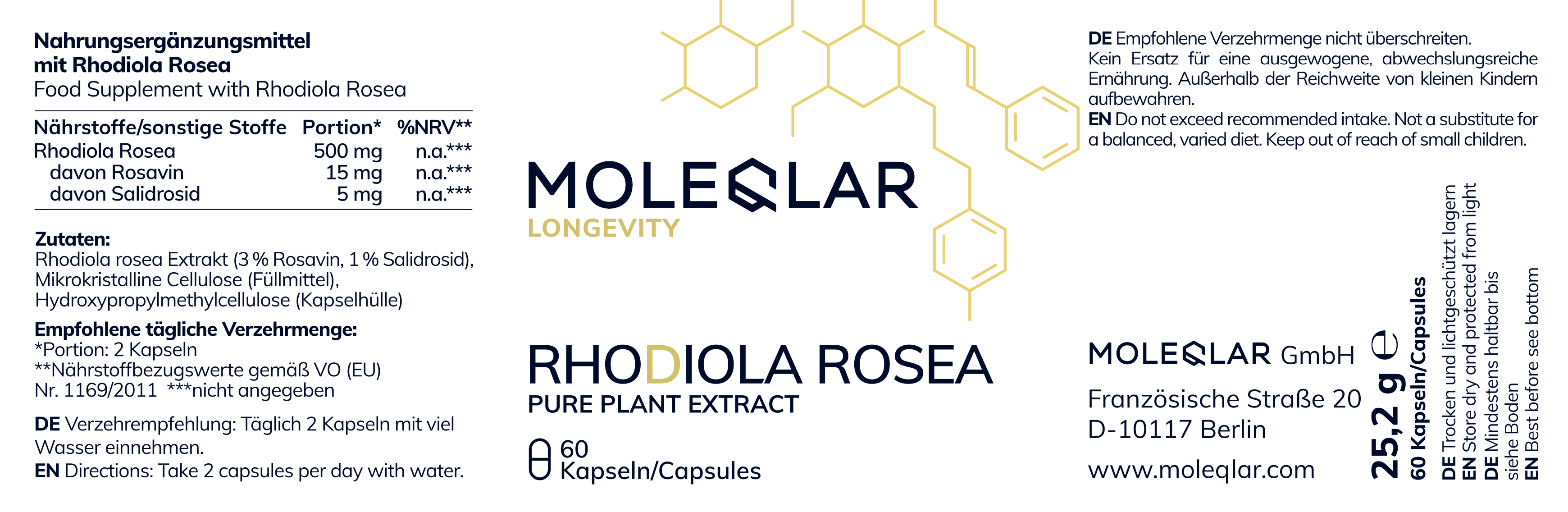- Rhodiola Rosea Kapseln aus standardisiertem Rosenwurz-Extrakt mit stabilem Rosavin (3 %) und Salidrosid (1 %)-Gehalt