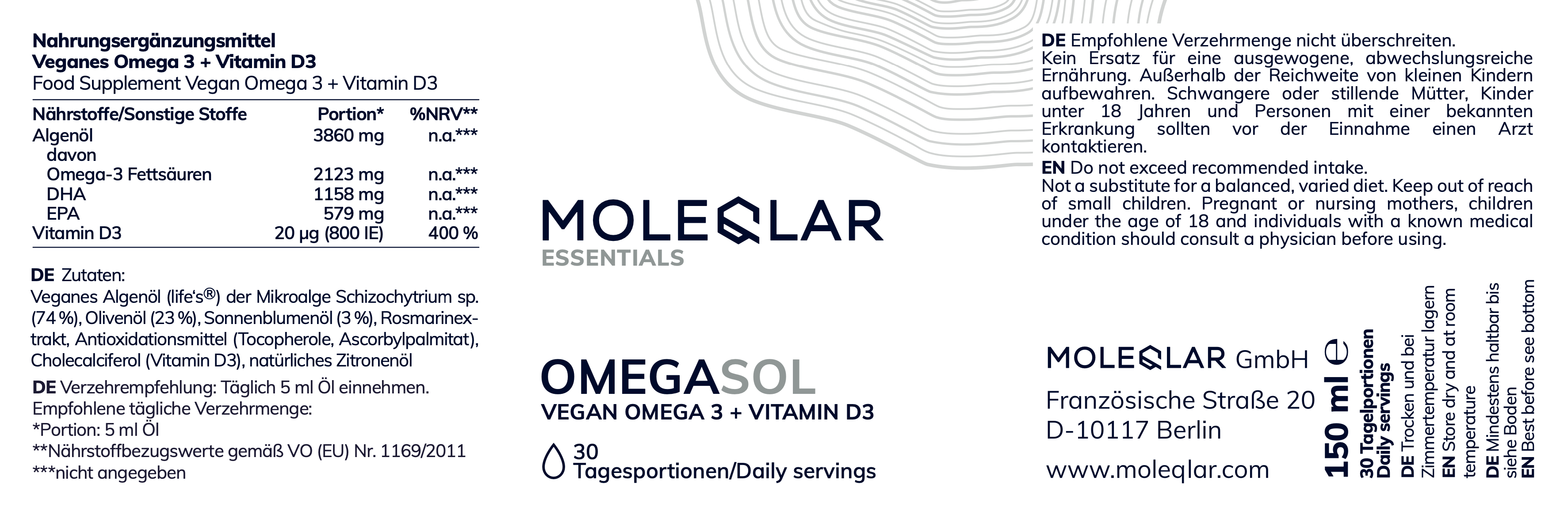 - Eine Flasche mit 150 ml OmegaSOL entspricht einem Vorrat für 30 Tage (Eine Portion = 5 Milliliter)